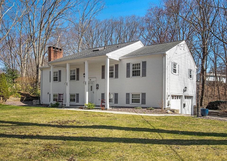 Attractive and stately looking oversized Raised Ranch situated on a picturesque setting. The sprawling fireplaced living room features hardwood flooring and offers a dining room area that goes into a HUGE KITCHEN with tons of cabinetry, center island and Corian counters. The kitchen walks out to a huge trex deck with a private backyard makes this home great for entertaining. 3-4 beds, 2 1/2 baths, master bedroom has a pulman bath and a Jack and Jill bath for the other 2 bedrooms. Lower level features a nice family room with a wet bar and lavette that walks out to your yard. HUGE 2 car garage. Updated heat, hot water and electric. 3/4 acre lot. Note: house has a cesspool. Buyer responsible for upgrading to septic.