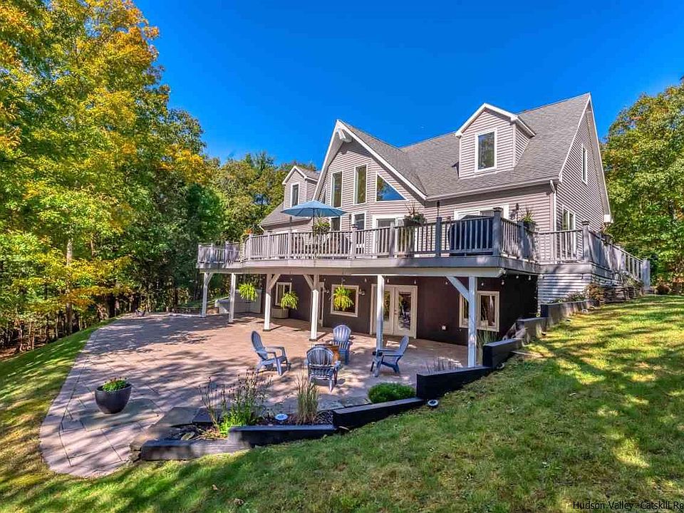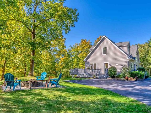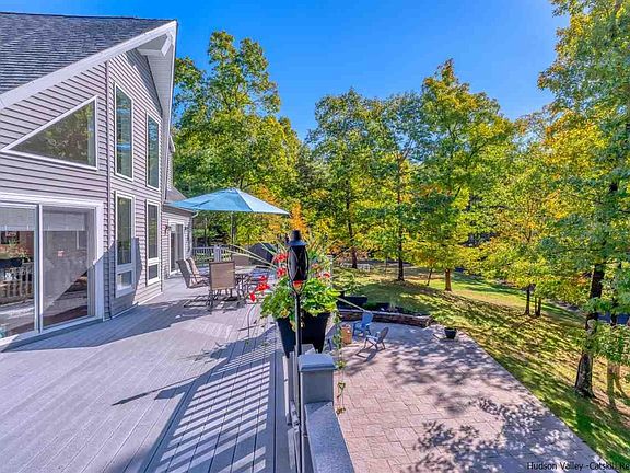 Serenity now!! Located on a long winding tree lined road off the beaten path on just under 9 acres on top of a mountain you will find this magical setting where this contemporary styled cape is nestled. As you walk in thru the door you will be instantly astonished as you take notice to the high vaulted ceilings accented with a wall of windows with southern exposure, you can only imagine the abundance of natural sunshine that lights up this home. The gleaming tiger maple wood floors compliment the gorgeous wood-burning fireplace. Once you are able to take that all in… the main level continues to provide that open floor plan that you always wanted. The dining area is open to the kitchen with center island stainless steel GE profile appliances which is perfect setup for entertaining and all your family gatherings. The master bedroom en-suite is located on the first floor with master bath which includes a shower double sink vanity jet styled tub and toilet. Don’t miss the half bath with laundry room that offers heated ceramic tiled flooring that is great to keep your toes warm while folding your clothes. You can access the over 800 sqft deck from one of the four sliding glass doors located in the master bedroom, great room and dining. Upstairs there are two large bedrooms with walk in closets along with a full bath complete with tub/shower combo single sink vanity and toilet. The full walkout basement which is completely finished with radiant heated floors, full bath and additional room that is currently being used as a home gym. Custom bar for yet even more entertaining purposes and with the ability to walk out onto the partially covered gorgeous stone patio…And for those great summer and fall nights there is a handcrafted fire pit to enjoy your night. This home has been well taken take of and loved over the years… Best part is you have the seclusion but yet only 5 minutes from the NYS thruway and uptown Kingston….in addition to close proximity to top notch skiing, Woodstock and Rhinebeck. Come see for yourself.