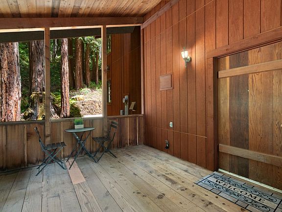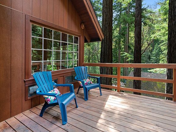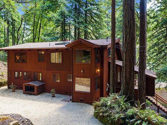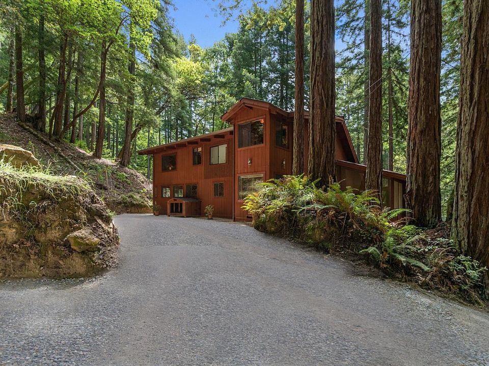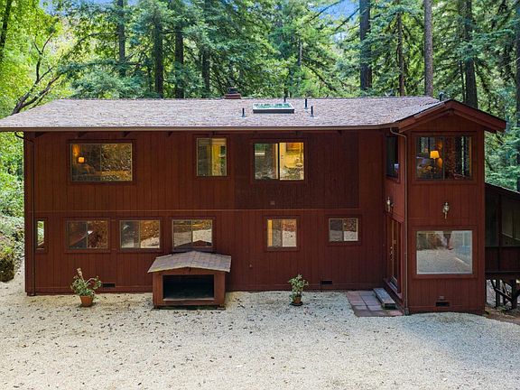 Private Ben Lomond retreat, 3BR/2BA plus detached guest unit. Situated on 7+ ac, surrounded by lush redwoods and a creek w/ a small waterfall, the only noises you hear are the peaceful sounds of nature. Spacious rooms feature beautiful woodwork throughout, from the floors to the cabinets, walls & vaulted ceilings, giving the home a cozy wood cabin vibe. Large living room w/ fireplace and sliding door to the back deck, plus formal dining room w/ stylish brick floors. Nicely updated kitchen w/ stainless appliances, double oven, ample cabinet & countertop space, and walk-in-pantry. Sizable master bedroom suite w/ walk-in-closet & attached bath w/ jetted tub & views. Two additional rooms, an upstairs bedroom w/ sunroom, and downstairs room w/ a built in desk & wood burning stove. Home also has 2 enclosed porches and a newly rebuilt front deck. Detached garage w/ room for parking & storage, plus a studio apartment. Located just minutes from town, shopping, dining & recreation.