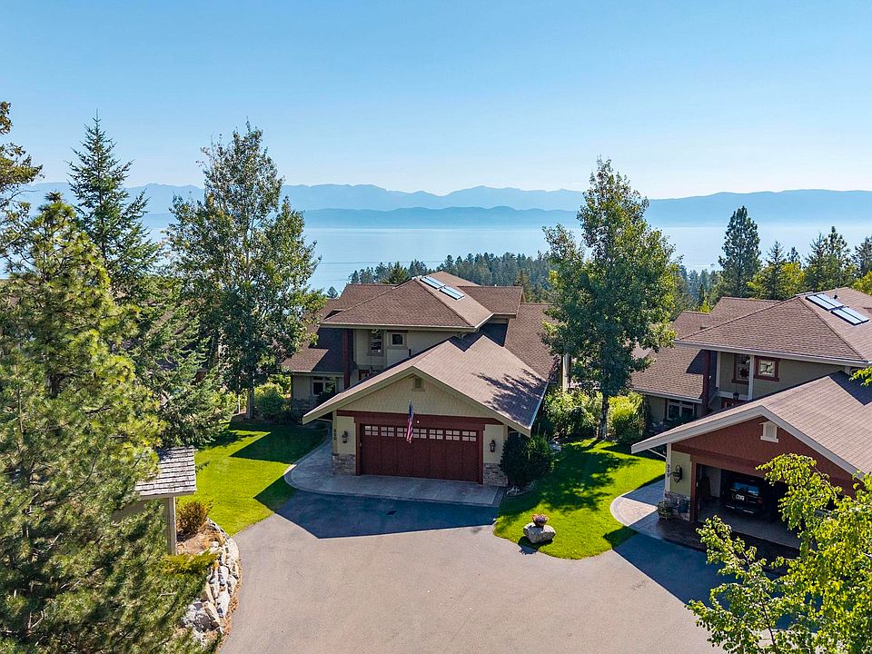Experience Montana luxury in this 4,426 sq ft executive-style home featuring 4 bedrooms, each with its own en-suite bathroom plus an additional half bath. Designed for comfort and convenience, this residence offers main-floor living, expansive walk-in closets, and stunning views of Flathead Lake and the surrounding mountains from every room. The open-concept main level boasts hardwood floors, granite countertops, and high-end appliances, creating a chef’s kitchen that flows seamlessly into the living and dining areas. Two gas fireplaces add warmth and elegance, while the executive primary suite on the upper level provides a private retreat. Wellness and leisure are built into the design with an exercise room and sauna, perfect for relaxation. Outside, enjoy two private boat slips with an 8,000 lb lift, giving you direct access to Flathead Lake. Located in the coveted Cherry Hill community, residents enjoy resort-style amenities including a private marina, clubhouse, beach with picnic tables, and pickle-ball courts. The lock-and-leave lifestyle is effortless with HOA-covered snow removal and lawn care. Additional highlights include a new heat pump installed in 2024, ensuring comfort and efficiency year-round. This home is the perfect blend of sophistication, convenience, and Montana’s natural beauty.