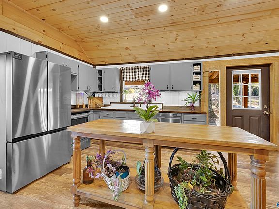 Leesburg-walk to Weiss Lake and Deck and Docks! Custom, log cabin home on a corner lot, chain-link fencing, and paved driveway! Open living room to kitchen with tongue and groove ceilings with can lights. Kitchen overlooks back yard with eat-in dining room and oversized pantry! Living room offers room, vaulted ceiling, and door to side patio. Upstairs boasts 660 sqft with possibility to fit another bedroom or flex space, if needed. Seasonal views of beautiful Weiss Lake and minutes from several boat launches. Home is over 2400 soft and sited on 1.5 acres! New Price $360,000
