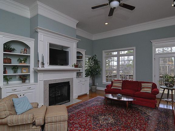 - Living Room: Fireplace, Floors-Hardwood, French Doors, Molding, Books, Entertainment Center, Ceilings-High (over 9 Ft), Ceiling Fan, Recessed Lights