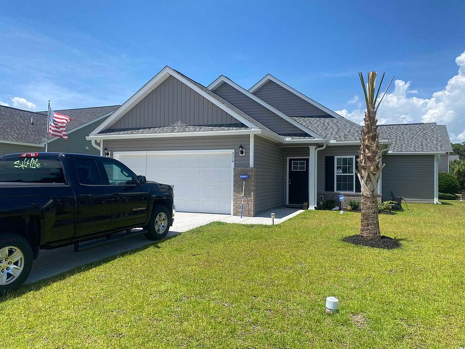 This a Quick Move-In home. Golf cart to the beach from this beautiful custom floor plan home, by the local builder voted Best of the Grand Strand and Best of the Beach for the third consecutive year! In the Ocean Palms community (Voted Best Neighborhood!). This terrific 3 bedroom, 2 full bath, open floor plan home has upgraded waterproof lvp flooring throughout - no carpet. Stainless appliances, white cabinetry, quartz counters with a cast iron and porcelain farm sink, a beveled subway tile backsplash, a walk-in pantry and a convenient breakfast bar with added pendant lights combine to give the kitchen the wow factor you're looking for. The abundant recessed lighting and a slider in the open great room flood the home with light. The slider leads to a large covered porch and adjacent concrete patio. The spacious owner's retreat features quartz counters and undermount dual sinks. Plenty of storage can be found in the cabinetry, linen closet, and walk-in closet. Two additional bedrooms and a bath are tucked off on their own private hallway, for privacy. All of the homes in Ocean Palms come standard with the luxury of natural gas (tankless water heater, gas heat and a gas range). The garage is completely trimmed and painted, with floored attic space accessed by drop-down stairs, and the front and back yards are fully sodded. Ocean Palms is conveniently located near shopping, restaurants, schools and world class medical offices and hospitals, and a short golf cart ride to Surfside Beach's gorgeous beach and the Atlantic Ocean. Other floor plans and inventory homes may be available. Community pool and cabana now open!