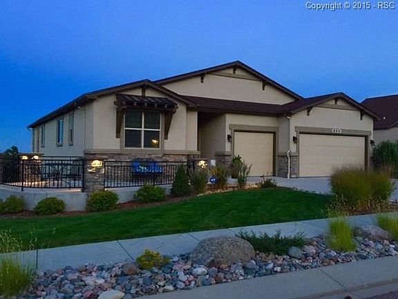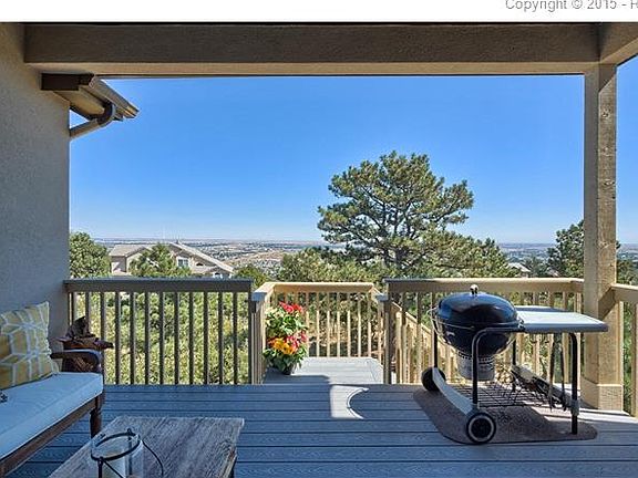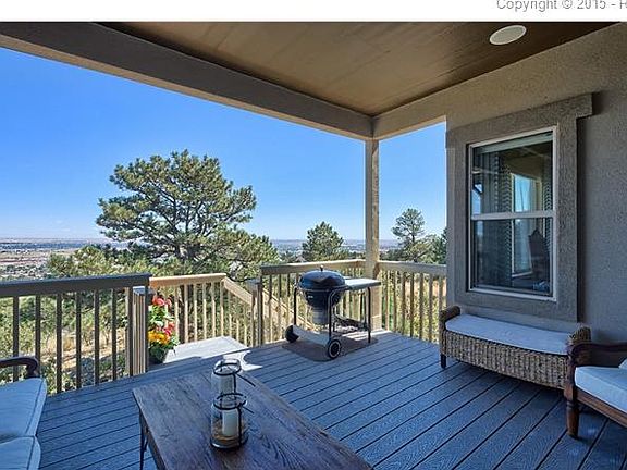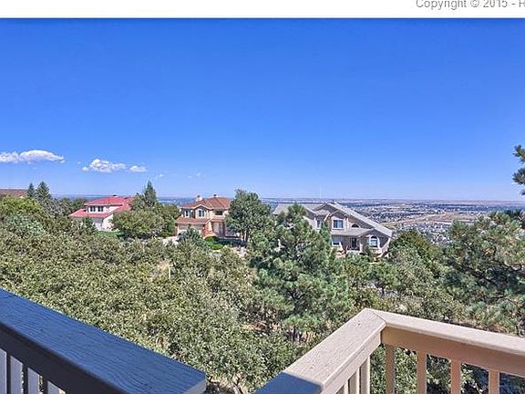 Stunning walk-out Rancher situated on .5 acre lot. Located in one-of-a-kind Broadmoor Ridge neighborhood on a flat street with very little traffic. Just a 3-minute walk to Cheyenne Mountain Elementary or Oak Meadows Park. Very bright, open floorplan with mountain views from the front and sprawling city views from the back that can be enjoyed from the Master Bedroom, Family Room, Deck, Eat-in nook and Office! Hand-troweled walls, 9-ft ceilings in the lower level, covered deck, built-in surround sound system, extended 3-car garage. Custom-designed kitchen w/large extended island featuring wainscoting and granite countertops. High-end Kitchen-Aid appliances, 6-burner gas cooktop and double oven/convection. Bright Master Bedroom provides stunning city views. Spacious and light walk-out lower level. Lots of room for play and a large wet bar for entertaining. Energy-efficient hot water heater and furnace, monthly utilities are very low! Extensively and professionally landscaped, surrounded by well-kept homes and manicured lawns. Relax on the backyard flagstone patio off the walk-out lower level or enjoy the mountain views from front patio featuring lighted stone columns. Large, but discrete, vegetable garden area protected from deer by a custom wrought iron fence. Backyard is full of opportunities to explore in the native scrub oak and provides quick access to walk to school.