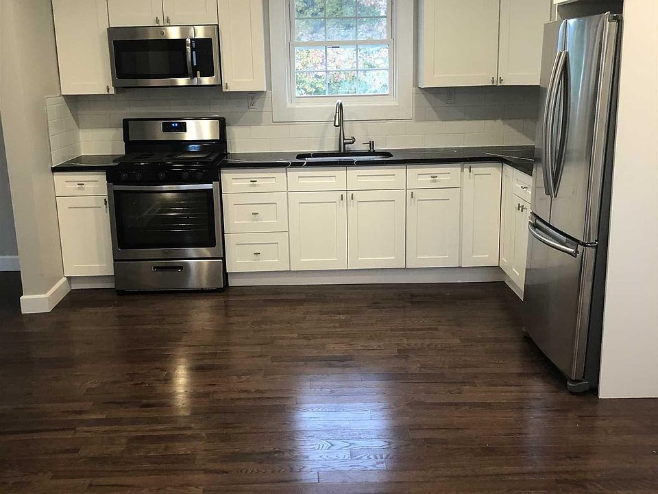 Newly renovated 3 bdrm, 1 bath apartment on the 2nd level with mountain views and off street parking. Open floor plan includes kitchen with beautiful stone counters and stainless steel appliances (gas range), dining room, living room and hardwood floors throughout and central air. Everything is BRAND NEW never used. You would be the 1st tenant. Plenty of light fills this space. Located across from Groville Mills, you are just a short walk to Industrial Arts for you beer lovers, the Greenway trail just across the street for you nature lovers and walking distance to Main St. Pets considered on a case by case basis. Owner pays trash and sewer. Tenant pays gas, electric.