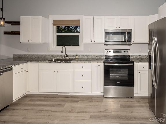 This newer construction is located in the trendy West Asheville area and is conveniently close to local restaurants and breweries. It is also just a few minutes away from downtown Asheville. The house is an attractive one-level Arts and Crafts style home situated on a level .26-acre lot. It offers three bedrooms and two full bathrooms, an open great room that flows into the kitchen, granite countertops, stainless steel appliances, luxury plank vinyl flooring throughout, and tile bathroom floors. Other features include covered front and back porches, a laundry room, and a split bedroom floor plan.