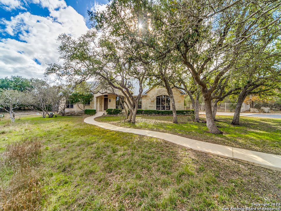 This one owner single-story home is nestled on 3.8 private acres with mature trees and natural vegetation in Cordillera Ranch! Beautiful lot with mature trees and a swimming pool offered at the lowest dollar per square foot price in Cordillera. The price reflects that the home needs updating but has been well loved and taken care of by the owner. The open floor plan features detailed ceiling treatments, crown mouldings, neutral tile flooring and an abundance of windows which provides natural lighting throughout. The warm and inviting great room is the heart of this home and is complete with a stone fireplace with gas logs, custom built-in shelves and private backyard views. This space opens to the kitchen and breakfast nook, which is ideal for everyday living and provides an ease of flow when entertaining! The island kitchen showcases a wraparound sitting bar, a plethora of workspace and custom cabinets, stainless steel appliances, gas cooking, plus a home management center with flex space for additional seating or a quaint lounging area. The separate dining room is ideal for Sunday brunches and holiday gatherings. Working from home takes on a whole different feeling in the private study, which is complete with a soaring, vaulted ceiling, striking stone fireplace, dual built-in bookshelves and cabinets, outside access and beautiful property views! The owner's suite features dual vanities, plus a sitting vanity, jetted tub and walk-in shower. A game room is the only room that is located on the second level and could be customized to fit your lifestyle! The backyard offers something for everyone and your entertainment options are endless! There are multiple covered patios for lounging and dining with family and friends and a fireplace to keep you warm on chilly nights. The patios both overlook the sparkling pool with an adjoining spa, for year-round enjoyment and the vast backyard that offers bountiful space for leisure and play. For the green-thumb enthusiast there is a fenced garden area with raised beds that are ready for you to start planning your favorite herbs and vegetables. The serene atmosphere of this property is so welcoming and offers hill country living at its finest! The home also has a 26 gpm gallon per minute well!