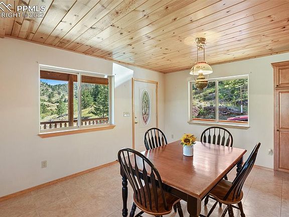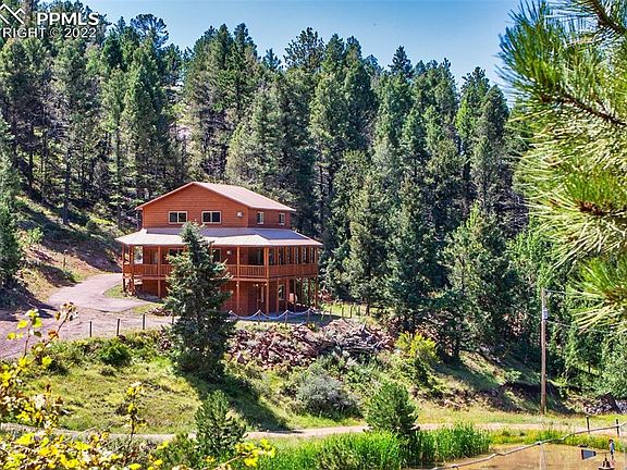 Amazing space in an amazing place! Just coming down the driveway lets you know you're someplace special as you curve around the flow through pond. 3/3/2 spacious cedar sided home has so many options for use of space, you may need to look through it more than once to come up with your plans. Upper level could be a large master suite, home studio or secondary living area. It has its own office space, bedroom, sitting/coffee bar area as well as large living room/studio space/or master bedroom space, bathroom and generous windows to enjoy the valley view and wooded areas outside. Its a flexible space to use as you choose. Main level uses the same square footage in a more traditional manner incorporating a kitchen, dining area, living room, bedroom with walk out, full bathroom and laundry area for main level living ease which you can enter directly off of the side deck or front door. You can even step into the built in sauna or out into an enclosed porch area off the bedroom with sliding glass doors to catch the mountain breezes and views. The lower level again encompasses yet another walkout living area which could be a family room, recreation room or suite. A 15x13 room could easily be yet another bedroom if you added a closet, or use the walk in storage area as a closet, there is a third bathroom and utility room. The Rennai heater in this room sends heat upstairs through the log railed staircases. Supplemental heating is via gas log fireplaces on main and upper levels as well as electric baseboard throughout this wonderfully flowing spacious and floor plan. There are 3 bedrooms with closets and the option to add a 4th by adding a closet. Locations such as this are a rare find....shouldn't it be yours? Just minutes to Cripple Creek and its amenities, or less than an hour to Woodland Park or Canon City.