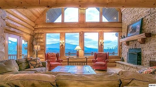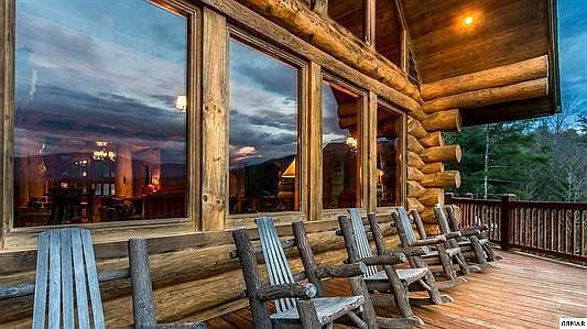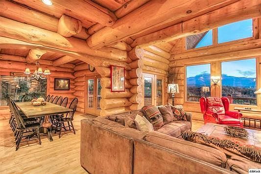 Bear Hollow Lodge was featured in Log Homes Illustrated with good reason. Massive Paul Bunyan sized logs combine with majestic Smoky Mtn. views to create the perfect mountain lodge. Impressive mahogany doors welcome you into the foyer of the lodge. The view draws you into the great room w/ stacked stone gas log FP, cathedral ceilings, walls of glass and wood floors. The chef's kitchen is equipped w/ stainless steel Frigidaire appliances, island & granite counter tops. The dining table is large enough to seat 14 and there is additional seating for 10. The main level master suite has incredible views and opens to the deck. The master bath features a ceramic tile shower & large Jacuzzi tub. Follow the unique, 4' wide staircase made of pine logs upstairs to 2 additional master suites. There is There is a master suite on each side of this level, separated by a large reading area & additional bedroom. On the lower level you will find the game room, outfitted with flat screen TV & surround sound, pool and foosball tables and sectional couch. The utility room with full size W/D is located on this level as well. You will also an additional master suite on this level. All furnishings and decor in the lodge are upscale. It is not your typical cabin decor. Bear Hollow Lodge has 3,51 acres, 7 BR's, 5.5 BA's, and sleeps 26. It is large enough for everyone to enjoy their privacy and has enough space to gather for meals & entertainment.