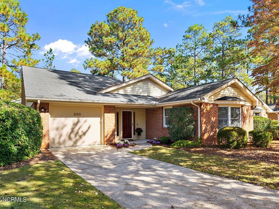 SPACIOUS TOWNHOME in sought-after Pinehurst Trace. This popular 2 bedroom / 2 bath split floorplan features a large bedroom and hall bath in the front of the home and the second bedroom and bath in the rear of the home, allowing for privacy between guests and owners. The main living areas feature LVP flooring, and the kitchen was partially updated in 2016 with new counter tops and slate stainless appliances. In 2022 a new garbage disposal, kitchen faucet and recessed lighting was added to brighten up the kitchen for cooking. Bathrooms have been updated with accessibility in mind to include walk in showers, and owners' bath has built in hand bars as well as a fixed shower head and a movable handheld shower head. Pinehurst Trace offers community amenities including a clubhouse with full kitchen, billiards room, library, and fitness room; outdoor pool, tennis and pickleball courts. Exterior yardwork is covered in the HOA dues, rotation of power washing/painting as well as roof maintenance and replacement is also covered on an as needed basis. THe community is located close to shopping, medical and the Village. Pinehurst Trace is a 55+ community and residents must meet the age requirement to live in the community. Seller is related to listing agent.