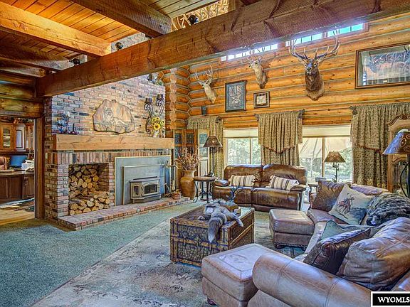 A stunning piece of Wyoming architecture with so many custom upgrades and so much flair! Solid log of Swedish cope construction, beautifully maintained, and t&g ceilings and beams throughout create such ambiance, inviting you to cozy up with a good book and glass of wine. It all begins in the custom crafted entry of solid log posts, steps and barnwood accents. Two story great room has an efficient wood fireplace & custom built antler chandelier. Open kitchen works really well for entertaining & offers