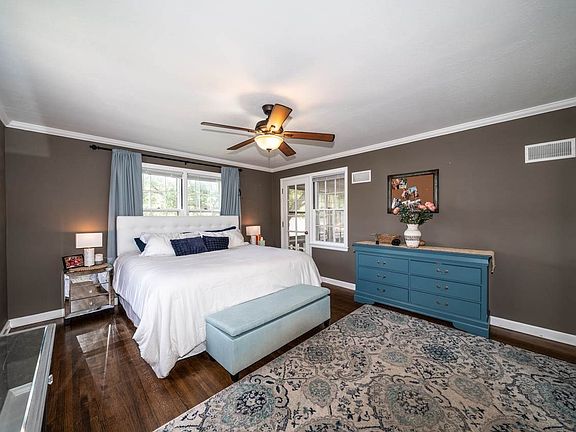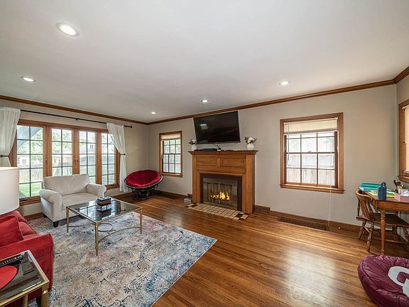 Charming 1 1/2 story complete with great garden areas, beautiful hardwood floors throughout, large windows, lovely living room with fireplace, neutral décor, crown molding, formal dining area with chandelier, sun room with two built-in bookcases, fabulous kitchen with tile backsplash, breakfast bar, 2 lazy susans, great cabinet and counter space, and neutral décor. The spacious main floor bedroom features two closets and large windows. The second level includes a second master bedroom with large windows, 2 closets, door to the screened in balcony, updated full bathroom, the third bedroom with access to the screened in balcony, the front balcony, and walk-in closet, and walk-in cedar closet. The partially finished basement has the perfect rec area with concrete flooring, fluorescent lighting, and neutral décor. Sit back and relax out on the patio while overlooking the expansive backyard with wood fencing and mature trees!