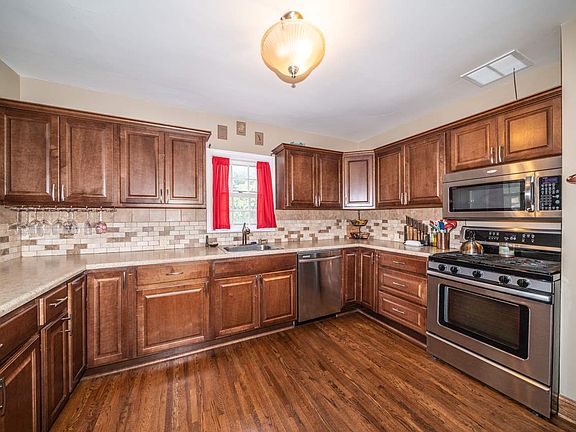 Charming 1 1/2 story complete with great garden areas, beautiful hardwood floors throughout, large windows, lovely living room with fireplace, neutral décor, crown molding, formal dining area with chandelier, sun room with two built-in bookcases, fabulous kitchen with tile backsplash, breakfast bar, 2 lazy susans, great cabinet and counter space, and neutral décor. The spacious main floor bedroom features two closets and large windows. The second level includes a second master bedroom with large windows, 2 closets, door to the screened in balcony, updated full bathroom, the third bedroom with access to the screened in balcony, the front balcony, and walk-in closet, and walk-in cedar closet. The partially finished basement has the perfect rec area with concrete flooring, fluorescent lighting, and neutral décor. Sit back and relax out on the patio while overlooking the expansive backyard with wood fencing and mature trees!