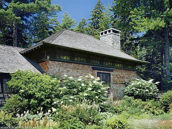 Located on Sargeant Cove, Watermark offers a private, intimate, and quiet location. This modern shingle-style residence with four bedrooms, 5 baths, granite fireplace and detached garage with guest space above. The 5+/- wooded acres with 497+/- feet of shore on a tidal inlet attracts wildlife including loons. Arranged for entertaining, including an outdoor fireplace with a wide covered porch that offers extra seating. Lovely gardens and many features.