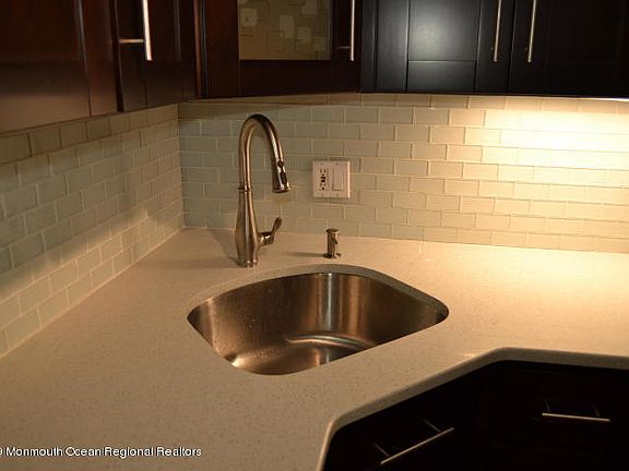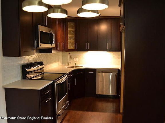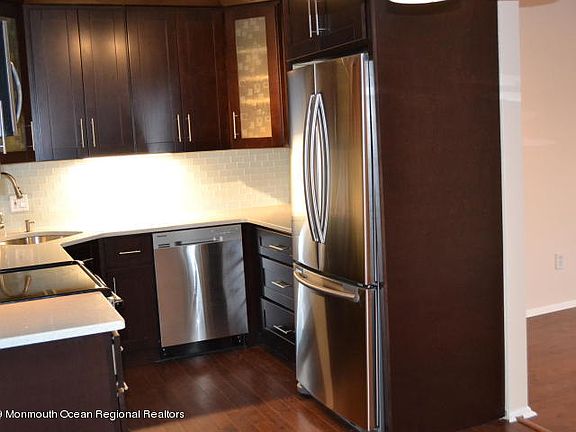 Updated 2 bedroom 1 bath upper level end unit in a beautiful waterfront community with complex's private beach. Stunning updated kitchen with oversized high quality slow-close cabinets w/garbage bin and spice rack, stainless steel appliances, quartz counter tops and mosaic backsplash. Hardwood floors throughout. Master bedroom with large walk-in closet. Conveniently located adjacent to NYC Ferry Sea Streak Ferry, close to Hartshore Woods, Sandy Hook beaches, shopping and restaurants. NO PETS ALLOWED.