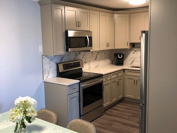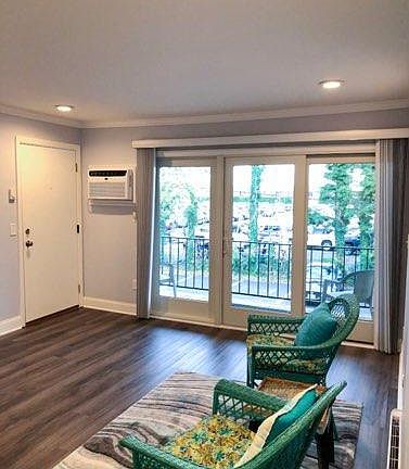 Newly renovated condo on upper level with private beach, water view and next-door walk to SeaStreak Ferry, Henry Hudson Trail, Marina Restaurant and more. Brand new kitchen with Quartz counters, stainless steel appliances, in-line water filtration system, new floors and crown molding throughout. Bathroom updated with navy blue vanity and matching new tub tiles. Living room has recessed lighting, brand new 3 panel sliding door, and bedroom has new-large window and ceiling fan. Amazing location. NYC seen from property/beach. Clean and light colors; ready to rent quickly! Annual lease and no pets are allowed per the association rules. Washer/dryer on site.