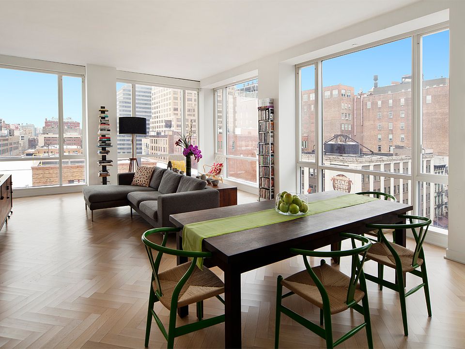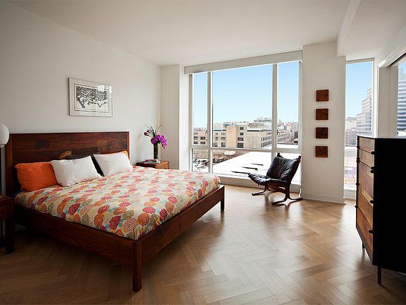 A perfectly chic corner residence in the iconic Urban Glass House. This loft-like two bedroom apartment is the quintessential expression of modern Downtown luxury living. Upon entering, one is immediately captivated by the high ceilings and floor-to-ceiling glass that wraps the entire expanse of the space. Gorgeous natural light streams throughout the day from the double Western and Northern exposures. The masterfully re-imagined design, born from the creative genius of the current seller, further enhances the spaciousness of the home. The Bulthaup kitchen finished with Miele, Viking and Kuppersbuch appliances, custom Wyeth fixtures and Sub-Zero countertops, blends seamlessly into the large living room; ideal for entertaining. The custom bar and music room was completed with a designer at Bilotta and the bar-top is polished Calacatta marble. Both bedrooms feature en suite bathrooms with radiant heated floors, fixtures from Aero, Waterworks and Patdo. The ample closet space was custom outfitted by Brooklyn's European Closets & Cabinet. The floors are engineered unfinished white oak with a Rubio oil finish, the walls are painted with Farrow & Ball and the laundry area is neatly tucked away off of the powder room. The Urban Glass House is a boutique condominium nestled at the crossroads of Soho, Tribeca and the West Village. With only 40 residences, this building was famed architect Philip Johnson's last commissioned project and erected as a tribute to his own private Glass House in Connecticut. The common space interiors were designed by Annabelle Selldorf and the amenities include a 24-hour doorman, gym, bicycle storage and laundry room.