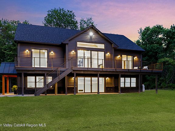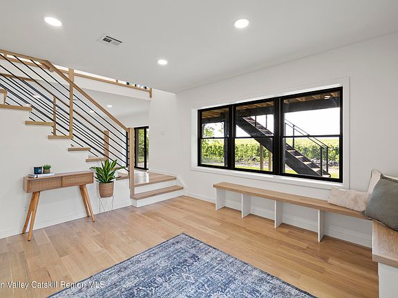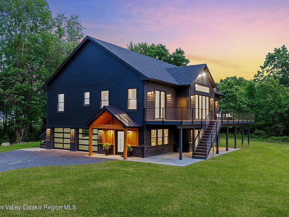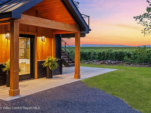 Welcome to Ridgeview Orchard Estate. Experience refined living in this exquisite new construction home, where sophisticated design meets the rugged beauty of the Shawangunk Mountain Ridge. Crafted with insulated concrete form (ICF) walls for superior energy efficiency and year-round comfort, this home is a true sanctuary of elegance and warmth. From the moment you step inside, you're welcomed by sweeping orchard and mountain views, hardwood floors throughout, and sun-drenched spaces that feel both expansive and inviting. The vaulted-ceiling living room features a striking fireplace and panoramic windows that frame the natural beauty outside. The chef's kitchen is a showstopper, equipped with Wolf appliances, an oversized quartz island, a wine and coffee bar, and a spacious pantry. Step onto the adjacent grilling deck or host unforgettable gatherings on the main, expansive deck that overlooks a peaceful apple orchard and the iconic mountain ridge. The primary suite is a serene retreat, featuring custom wood details, and sliding doors that open to the deck for morning coffee with mountain views. The ensuite offers a spa-like ambiance with sauna, free standing tub, shower. Two additional bedrooms with full bathrooms, one on the second level and one on the lower level, offer privacy and luxury for family or guests. The cozy lower-level family room opens to a bluestone patio, creating seamless indoor-outdoor living. A versatile extra room is perfect for a private home gym, creative studio, or tranquil office. A two-car garage with glass doors and built-in storage completes this perfect package. With its combination of rustic charm, modern finishes, and minimal upkeep, this home is the ideal escape, whether for a weekend retreat or full-time residence. Welcome to a new standard of mountain living. *Some rooms are virtually staged*