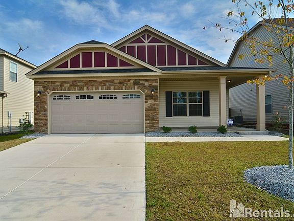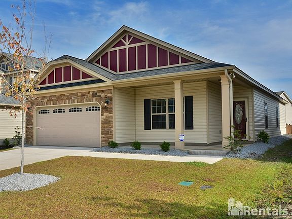 Fantastic 3 bedroom home in the Villages at Lakeshore subdivision off Longtown Rd in Northeast Columbia. This newer home on a cul-de-sac street boasts loads of high-end upgrades. Attractive Craftsman-style exterior w/ carriage-style garage door, stone-accented faade, and covered front porch. Covered patio in backyard. Beautiful hardwood floors in the main living area, granite countertops in the kitchen and baths, and oil-rubbed bronze fixtures throughout. Open plan living and dining area has vaulted ceilings, ceiling fan, and bar counter. Spacious open kitchen features custom 42-inch cabinets w/ crown molding, tile backsplash, and updated stainless steel smooth-top stove, built-in microwave, dishwasher, and French-door refrigerator. Master bedroom has high trey-ceiling, 2 walk-in closets, and a full bathroom with double vanities, garden tub, and separate shower. Two additional bedrooms and a second full bathroom. Laundry room off kitchen w/ included washer/dryer. Spacious garage has a customizable built-in organizing system. Tankless water heater and irrigation system. Community pool and clubhouse. Current security monitoring must be maintained by tenant. Location convenient to I-77 & I-20, Ft. Jackson, and Sandhills Shopping. Richland 2 Schools.