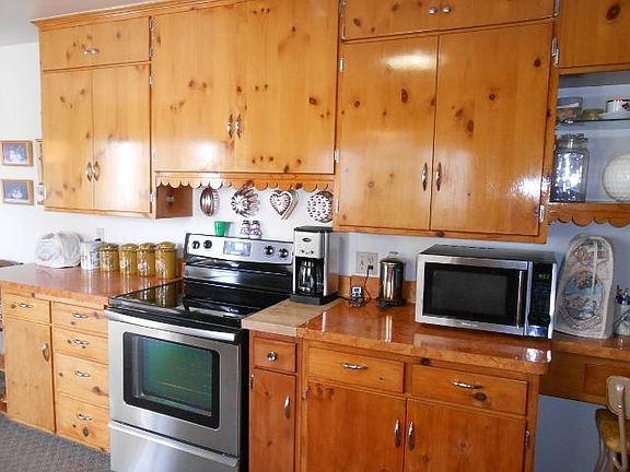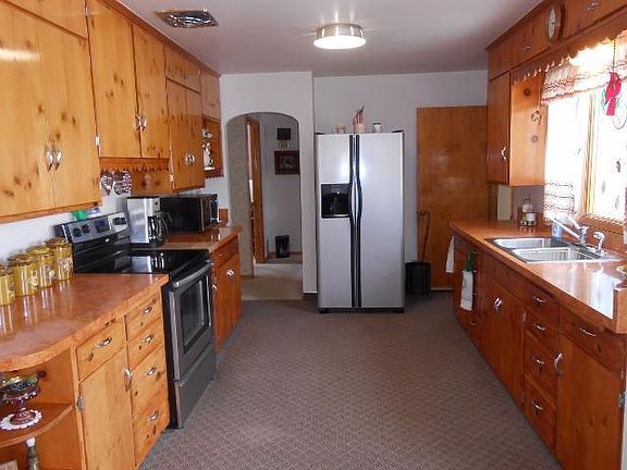 Located at the edge of town w/vast field views is this well taken care of 3 BR, 2 BA home on .36 acres. You'll be impressed with the beautiful woodwork, arched doorways, KT w/knotty pine cabinets and stainless steel appliances, and the sun-filled dining area that steps out to the private southwest facing deck. Semi-open floor plan. Oak floors under carpeted living room and bedrooms. Double closet in Master bedroom. There's a finished 3/4 bath in the lower level; the rest is waiting for your personal touch.