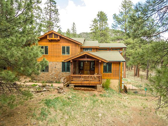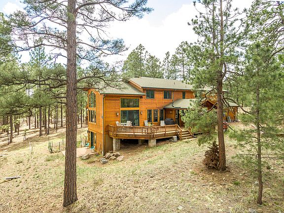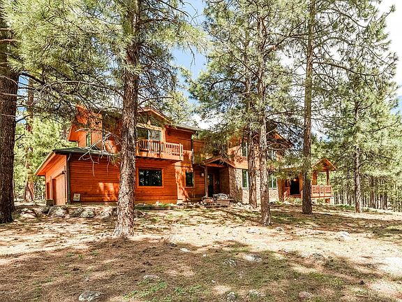 Spectacular home in quiet setting on 4.75 acres surrounded by ponderosa pines and bordering forest service. Premier location close-in to town and access to trail system, shopping and schools. Light and airy home welcomes you with tall windows to let the outside in and natural finishes blend the home with the surroundings including hardwood flooring and cabinetry, wood beams, rock exterior and fireplace, custom staircase, tile, more! Room with everyone with 6 bed, 5.5 baths, multiple living and eating areas, and loads of storage. Other rooms include a study, loft, huge rec room with new plank flooring. Oversized 3-car attached garage and det. 2-car garage with areas for shop or animals. Recently reduced price so you can update kitchen and baths with your own personal style.