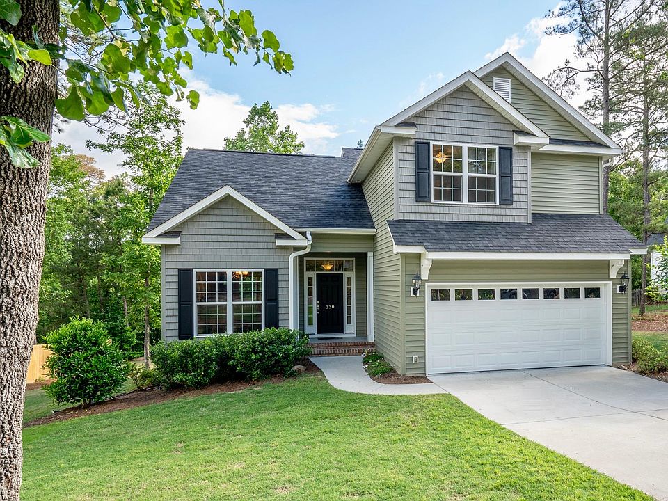 Beautifully maintained 4/2.5 with 2 car garage and paved extra parking pad, lush landscaped yard with private access to Pinehurst Parks Greenway Trail. Pinehurst schools, no HOA, mins from historic Village, parks, splash pad, hospital, shops and more. Open floor plan with hardwoods on first floor, master on main w/ tile walk-in shower, large walk-in closet; kitchen with granite countertops and breakfast bar, stainless appliances, pantry; formal dining area with wainscoating; living rm w/ vaulted ceiling and gas fireplace flanked by custom built-in cabinetry; covered deck off kitchen; powder room and utility room. 2 bedrooms upstairs w/ large bathroom and bonus room or 4th bedroom w/ huge storage area. Encapsulated crawlspace. Termite bond and 1 year home warranty. Built by Dabbs Bros.
