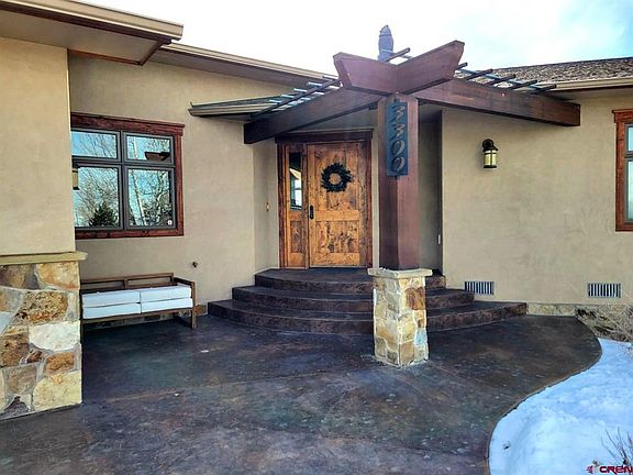 It just doesn't get much better if you're looking for the highest quality in design and craftmanship, awesome views of the San Juan Mountains, and a prestigious location in the 1st Filing of the Brown Ranch Subdivision. You will also appreciate the close proximity to local attractions such as the Bridges Golf Club, the City Recreation Center and all the retail and restaurant options at the south end of town. The 1/3 acre Lot borders open space on the south side, and beautiful trees, landscaping and perimiter fencing around the back yard. The main level of this southwest style, contemporary home features 2,034 SF of Great Room with a gormet-class Kitchen and a huge Master Bedroom Suite. The Great Room includes a gas-log fireplace with hearth and surround adorned with Brazilian stone. Majority of flooring is engineered hickory. The Kitchen, baths and laundry room all have Italian porcelin tile floors. All built-ins, cabinets and woodwork are stained alder. Countertops are all seamless Corian. The kitchen has a large island with a built-in cook top and retractable exhaust fan. Appliances are all stainless steel by Kitchen Aid and Kenmore Elite. The Master Suite is uniquely laid-out with an internal hallway to access two separate walk-in closets, the 5 piece Master Bath, plus your choice of two rooms, located front and back; one for sleeping and the other for office? den? fitness? The Master Bath has double vanities, a soaker tub, and a walk-in stone tile shower. From the garage you'll enter a mud room which connects to a walk-in pantry and spacious laundry room. The Maytag Washer/Dryer set are also included. There are 3 decks off the south and west sides of the main level. The kitchen deck has a pergola and includes a gas grill with natural gas hook-up. The living room deck is wide-open and provides the best 180 degree views. Another spacious deck off the Master Bedroom is fully screened-in and covered for relaxation and privacy. All decks utilize Trex decking and metal railings. The 1,100 SF walkout basement has two bedrooms, a full bath, a sitting area, and a large storage/mechanical room. Flooring consists of colored stamped concrete. Additionally, the basement area may be closed off from the main level via a sliding, solid wood barndoor. The garage contains a large safe and TESLA Car Charger, which are both included. Overall this home will impress with it's style, functionality, and "like-new" condition. Be sure to checkout the Matterport Tour link.