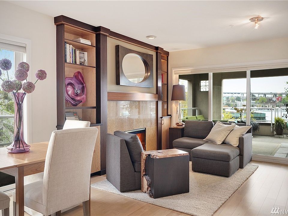 Spectacular water view! Spacious entertaining deck, private corner unit on second floor, view of trees and plantings. North Lake Union Condo, High-In Designer upgrades through-out. Remodeled kitchen and bath, granite counter tops, hardwood floors. Artistic cabinetry, Wolf range, Sub Zero 700 Series, Asko DW, Sharp Micro Drawer. New washer/dryer and gas HWT. One bedroom, Office space, bright open floor plan. Storage /parking in garage. Owner is a Licensed Real Estate Agent selling this property.