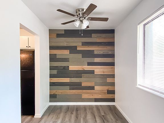 Modern sinkShiplap accent wallRenovated kitchenRenovated bathroomDining roomNew refrigeratorAmple storage closets
