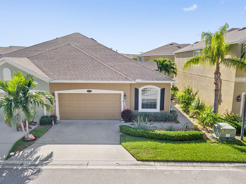 As waves crash along the nearby beaches, palatial ceilings soar over this townhome's sun-filled open spaces. Large tile flooring sweeps throughout the easy-flow plan. Granite counters, 42'' crisp white cabinetry, recessed lighting & a big pantry accent the bright breakfast bar kitchen. Spacious dining creates an inviting place to gather with friends & family. Sliders off the generous great room lead to a charming screened porch & open-air pavered patio that's perfect for outdoor grilling. An attractive owner's suite includes a walk-in closet, mosaic listello tiled shower, cultured marble vanity & handy linen cupboard. The washer & dryer are discreetly located in a closet off the kitchen. Lawn care is included! Stay active at the community clubhouse, pool & sports courts!