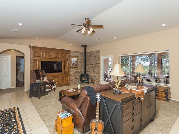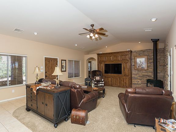 Great get-away - custom front gate; lots of trees; horse set-up with 4 stall horse barn; 60' round pin; inside home is comfortable and with neutral colors. Plush carpet and great decor. Pot belly stove (gas) acts as the fire place; hot tub; and nice size 3 car garage - Private well with 50 gallon pressure tank. Sit on the front porch and look at Granite Mountain.