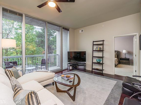 HIGHLY MOTIVATED SELLER! EXQUISITE high rise, largest square footage with 2 full private bedrooms/2 baths. Stunning views of the tree tops from your private balcony, gleaming hardwood floors, 10 foot ceiling/windows, stainless steel appliances, granite, breakfast bar, separate dining room/living room, IMMACULATE condition! Easy access to Chattahoochee River, trails, Braves Stadium & The Battery! Resort-like amenities with full gym, salt pool, hot tub, dog park, outdoor grill, conference room! Less then 30 minutes to the airport.