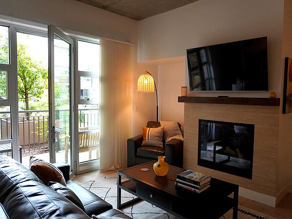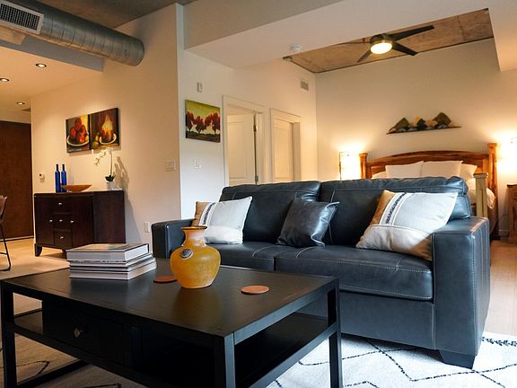 Welcome to this stunning fully furnished studio condo in the Peloton! This beautifully designed condo boasts an open concept floor plan that seamlessly blends together the living, dining, and kitchen areas. The furnishings include a king sized bed, queen leather sofa sleeper, and outdoor furniture. Natural light floods the space, thanks to the large windows that face a peaceful courtyard. The outdoor patio can even has a gate that leads out onto the lawn. The kitchen is equipped with stainless steel appliances, while cooking and entertaining is a breeze with plenty of counter space & a kitchen island for additional seating. This condo also features a gas fired fireplace! The in-unit and spacious laundry room comes with ample storage space for all your needs.