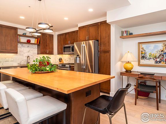 Sunny 4th floor unit featuring a long list of custom upgrades and stunning Flatirons views. Enjoy easy one level living w/ elevator access in this spacious modern condo at the highly desirable Peloton w/ Boulder's best amenities - rooftop pool, hot tubs, firepit, fitness center, rec room, meeting room, movie theatre, dog park and high-quality on-site restaurants including Basta, Naked Lunch & Dry Storage. Easily entertain in the spacious chef's kitchen w/ stainless appliances, gas range, wood cabinets w/ pull-out shelving, built-in wine cooler and custom Cherrywood island that comfortably seats 6. Open floor plan flows effortlessly to living room w/ high ceilings, gas fireplace, built-in walnut shelving and SW facing balcony w/ jaw-dropping Flatirons & Chautauqua views. Efficient balcony accommodates grill & bistro table plus gardening space for flowers & vegetables. The primary suite features custom blackout shades, walk-in closet w/ built-ins and a beautifully tiled bathroom w/ oversized soaking tub. Utility room includes floor to ceiling cabinets for all your gear and storage needs. Easy access to underground parking space close to elevator as well as 5' x 10' storage unit. Incredibly convenient location close to CU and all that Boulder has to offer.