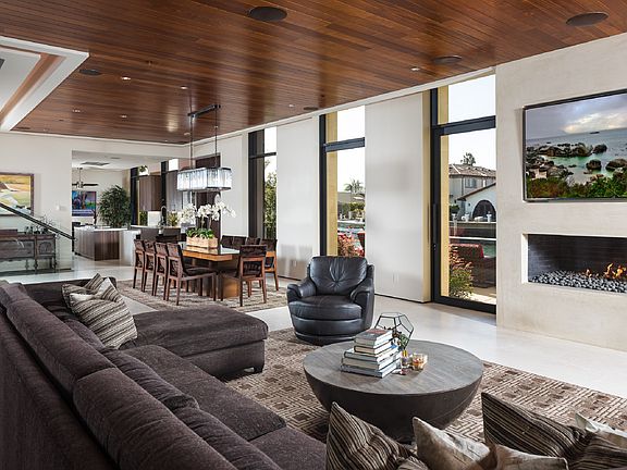 This Organic Modern luxury property has over 100 feet of water frontage and invites you to experience the best in Harbor living. Quite cul-de-sac location just off PCH. Walking distance to the Beach - surf. The open concept design and superior construction make this five-bedroom estate exceptional. The main floor showcases nearly 2755 SF of living space with floor to ceiling windows overlooking the channel, creating the ideal entertaining family home. Including attached mother-in-law apartment, featuring a full kitchen, laundry, bedroom w/en suite, living area and private patio. Fully equipped with state-of-the-art technology. This home boasts full automation and Lutron commands from a tablet or smart phone. Park up to three cars in the garage, featuring a lift and ultra-high 11-12 foot ceilings with added storage space and built-ins. Upstairs is additional 2620 SF showcasing two guest bedrooms, a true theatre room (optional bedroom) and an expansive master retreat with endless water and sunset views. A cozy fireplace and a view balcony. Host and entertain from the spacious game room and enjoy the tranquil second floor deck or take the stairs to a very large roof top deck showcasing both Harbor and Ocean vistas. This gorgeous home incorporates rich textures and elements, creating the ultimate in a luxurious home.