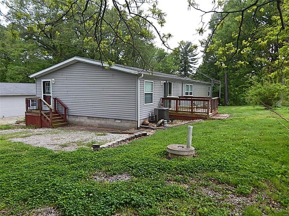 Manufactured home tucked into a wooded 2+/- acre property in rural Prairie du Rocher. Spacious inside, the side entry has a laundry room and a half bath and leads into the dining area which is open to the kitchen and living room. Living room has sliding glass doors that lead to the 11x10 deck overlooking woods and fields. Kitchen has an abundance of mission style cabinetry, some accented with glass doors, and an island in the center. On the other side of the kitchen is a family room and the master bedroom suite. Master suite features a walk-in closet and spacious bathroom with double vanity, skylights, and separate tub and shower. Beyond the master suite are two more bedrooms and another full bath with skylight. This property has a lot to offer outside as well, with a detached 2-car garage and utility shed. This is a charming home with plenty of space for family entertaining. Property is in the Red Bud School District.