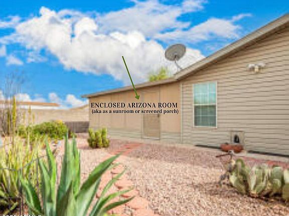 Welcome to this well-maintained 1,280 sq. ft. home, built in 2005, offering a perfect blend of comfort and convenience. Situated on a desirable corner lot with mountain views, this home borders a wash, ensuring extra privacy with no neighbors on one side. Step inside to vaulted ceilings and skylights, creating a bright and airy atmosphere. The spacious kitchen features ample cabinets and counter space, a breakfast bar, and a reverse osmosis system. The adjacent dining area offers a cozy space for meals and gatherings. Storage is no issue with extra cabinets in the halls for added convenience. The large master suite provides plenty of space to unwind, complete with a walk-in shower and double sinks in the master bath. A screened-in Arizona room extends your living space, perfect for enjoyi ng the outdoors year-round.