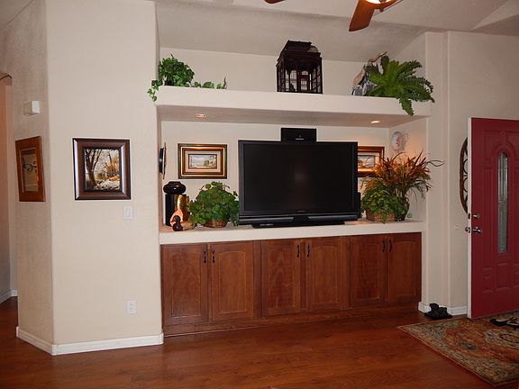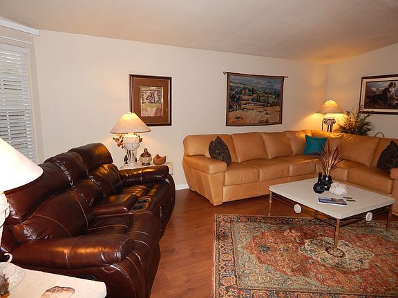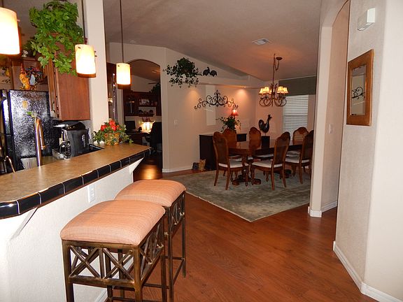 This lovely Cavco, La Cantania home is a must see! This unfurnished 2 bedroom 2 bathroom, plus a den AND an enclosed AZ room home is placed on a large lot! As you walk in this home you are greeted with a large living room with a built in entertainment center, bright dormer windows, a bay window, and a open view of the rest of the home! The formal dining room is large and will easily accommodate a big group. The informal dining room isn't anything short of spacious either! The kitchen is open and comes with all black electric appliances which include, a refrigerator, glass top stove, built in microwave, garbage disposal, dishwasher, washer and dyer. In the kitchen we have a breakfast bar, lots of storage, and lovely tiled backspash. The home has extra storage closets throughout the home! The den has beautiful archway that opens up to the large room with a wall lengh built in desk and cabinets, it could easily accommodate a day bed for extra room for guests. The guest bedroom is spacious and has a large closet for storage, the guest bathroom is clean and spacious. This home is also a split floorplan so your guest are close but not too close! The master bedroom has a walk in closet and a master bathroom connected to it, the bathroom has a large garden tub, walk in shower, private toilet, and walk in closet! There is beautifull brown laminate flooring throughout and all window treatments will stay with the house. The outside of this home is perfect for this Arizona weather! The enclosed Arizona room is so spacious and perfect for relaxing, it also comes with its very own portable cooling system for warmer months if needed. The garage can accommodate 2 cars and this home will have 4 of the pictured cabinets stay with the home!! Call today to see this super charming home. The home is located in a 55+ Active community. Enjoy the amenities of a resort style pool and Jacuzzi, fitness room, billiards, library, card room, shuffleboard, organized events and so much more! EHO, certain restrictions may apply. www.aznestfinders.com
