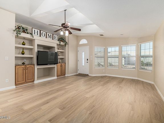 Stunning mountain views greet you from this beautifully upgraded 2 bed + office/den, 2 bath, 4 car garage home in the prestigious 55+ luxury resort community of Dolce Vita. Inside, the spacious open layout features vaulted ceilings, luxury vinyl plank flooring & a formal dining room. The kitchen offers both a breakfast bar & an eat-in area, along w/ample cabinetry & counter space—perfect for everyday living & entertaining. Both bedrooms are generously sized, & the dedicated office/den includes built-in cabinets & a desk, making it an ideal craft room, sewing room, or workspace. The oversized primary bathroom features a soaking tub, separate shower, dual sinks, a private toilet room, & a walk-in closet. A highlight of the home is the large screened-in Arizona room with tiled flooring, showcasing unobstructed, premium-lot views of the Superstition Mountainsno neighbors behind you, just stunning scenery. Additional upgrades include a new roof (2022), appliances and water softener (approx. 5 years old), and a rare 4-car garage with epoxy flooring and built-in cabinetryoffering exceptional storage and parking.