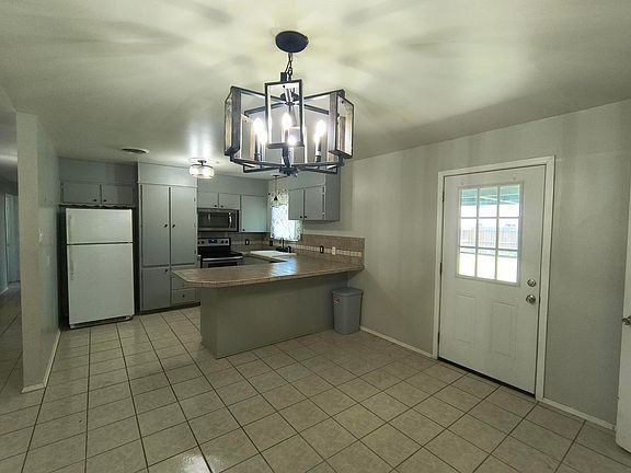 The kitchen area features a beautiful and modern chandelier that gives this common area a stylish and sophisticated touch.