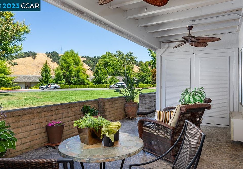 Extraordinary location for this special 2/2 Exp. Kentfield end unit ground level co-op with an expansive lawn and side garden. Enjoy a morning coffee from the unique mosaic river rock patio with spacious custom storage cabinet and ceiling fans, overlooking a grassy common area with beautiful views of the hills beyond. Added sunroom boasts a separate laundry area with full-size side-by-side washer/dryer, dual pane windows with custom honeycomb shades, and newer Amana A/C, a perfect place for crafts or an office/den. Reconfigured and remodeled granite kitchen with moveable island, tiled flooring and ceiling fan; plantation wood shutters throughout the home; extra hall closet; updated tiled bathrooms with custom frameless shower door in primary bath; close to carport plus lots of extra parking spaces. Many fine features, must see to appreciate!