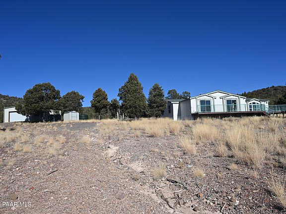 Located off a paved road with incredible mountain views, this incredible 3-bedroom, 2-bathroom home is set on over 5 acres, No HOA,in a prime Northern Arizona hunting region. Essential utilities, including two 2,500-gallon water storage tanks, a shed, pump house, pressure tank, and equipment. A spacious workshop/garage provides ample room for projects, storage, or recreational gear, while the home is equipped with septic, electricity, and thoughtful upgrades to make rural living effortless. Nestled in the heart of an outdoor enthusiast's paradise, this property offers a unique combination of rustic appeal, modern convenience, and stunning natural beauty. With over 2,346 square feet of living space, family room with a cozy fireplace and double sliding glass doors leading
