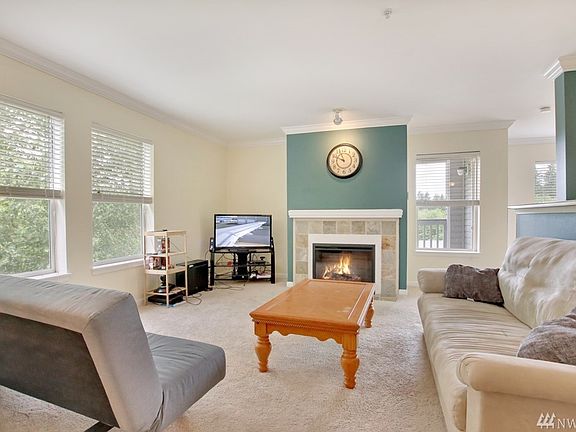 Welcome home!Top floor unit in desirable Latitude Condos. Warm fireplace in formal living and dining areas. French doors to 3rd bedroom, master Suite with walk-in closet and full bath. 3 bedrooms and 1.75 bathrooms with crown molding to accentuate this spacious unit. Individual one car Garage and private deck. Clubhouse with amazing amenities, exercise room & outdoor pool,/Pool Table, Fitness Center, Sauna & Jacuzzi. Close to all amenities & easy access to I-5.