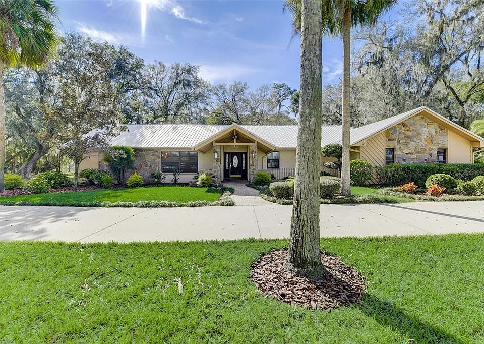PRICE IMPROVEMENT!! Experience the epitome of executive family living in this stunning residence, boasting 4 spacious bedrooms and 3 full baths on an expansive 4.52-acre parcel of breathtaking, high and dry land. Nestled on a serene street without the constraints of an HOA, this home offers a tranquil retreat. Upon arrival, the property captivates with majestic columns with lights at the entry & iron fencing, secured by drive thru electric gates on either side of the sprawling driveway. A grand entrance welcomes you with a covered front porch and meticulously landscaped surroundings. Step through the substantial entry door to discover custom features, including a flagstone wall and a sunken entry room, welcoming kitchen, and open floor plan. The heart of the home, the kitchen, is a culinary masterpiece. A large center granite counter island is illuminated by a skylight, complemented by ample counter space, cabinets, and a convenient closet pantry. The sink, strategically placed, overlooks the stunning backyard and provides easy access to the oversized 40x20 screened patio through a pass-through sliding glass door – perfect for entertaining. The Master Bedroom is a sanctuary of size and style, featuring an updated master bath with granite counters, a generous garden tub, bidet, dual vanities, and a fabulous walk-in closet. Throughout the home, enjoy the luxury of ceramic tile or real wood floors. The living room is a showcase of elegance with a wall-to-wall stone accent wall housing a wood-burning fireplace. Real wood beams add a touch of sophistication to the ceiling. The western 2.6 acre pasture, separately fenced and included with the home, provides additional charm and opportunities for animals and tax reductions. Noteworthy details include a 2018 metal roof, 2018 AC system, 2015 Hot Water Heater, Central Vacuum system, 2023 Electric Panel Upgrade, and a 2018 New Septic System. Two wells on the property, one for the home and one for irrigation, ensure reliable water supply. Take a leisurely stroll through the impeccably landscaped yard to discover a koi pond and a paver seating area with a concrete table and bird bath. Explore the endless possibilities of this custom-built, single-level home. Zoning permits additions such as mother-in-law homes, providing ample space to add a pool or barn. Endless opportunities await in this fabulous family home, just minutes from everything! Priced to sell, the sellers said to bring an offer!