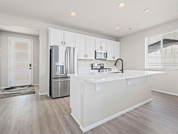 No need to wait for new construction with this turnkey ready home! This recently built Alexandrite model offers the finishes and upgrades you’re looking for with luxury flooring extending throughout the main level, a bright and open great room with gas fireplace, and dining area flowing into the beautiful kitchen with large center island, quartz counters, 5 burner gas stove, pantry and Stainless Steel appliances! True ranch living at its best with no stairs and easy access all around this property. Plenty of space for everyone with four bedrooms, including the primary suite with walk-in closet, and private bath with dual sinks, quartz counters and walk-in shower. You also have landscaping completed for you in the front and backyard. Plenty of storage space and great access to the 5ft high crawl space that covers the entire footprint of the home! Located in the awesome Prairie Center neighborhood, you have access to several parks, trails, walking paths and just a short drive to Oasis Family Aquatic Park, Prairie Center Shopping Center, Barr Lake and Todd Creek. Close to all major routes for convenient commuting to the Denver Premium Outlets, DIA, Denver and more. Don’t miss out on this wonderful option that is ready for you to move in!