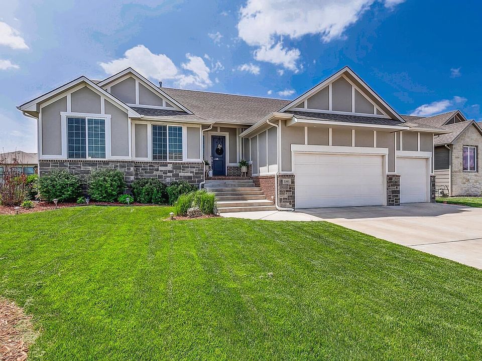 This is a one owner, model home that was built by Robl Construction/now Robl Building Co. The home has Hardi lap cement siding, cement trim that was built with manufacture 10 yr warranty (buyer must contact James Hardi ref to see if warranty can transfer). Home was built with upgrades such as R-38 insulation in attic, hip roof line, Polaris 42 in gas fireplace on raised patio, upgraded railing, wood floors, and so much more. The home has large windows for natural light including upper transom windows which are a higher end upgrade on newly built homes. There are 3 bedrooms on the main level with primary bedroom split from the other rooms by the main level walk through laundry room (with 2 entrances). Downstairs is a great family room with custom built in the owners had completed by the builder prior to closing, wet bar, and 2 more large sized bedrooms plus additional bath. This was always a highly desirable floorplan plus being in Maize schools at this incredible price, makes this a win to see and secure as yours today.