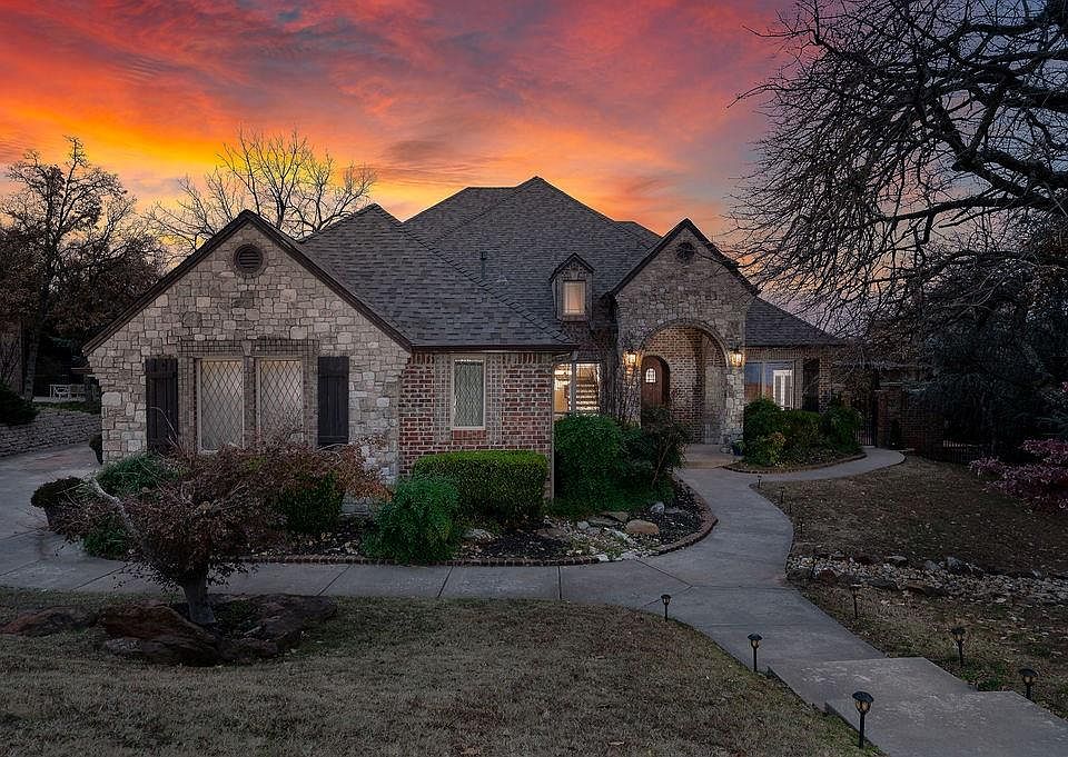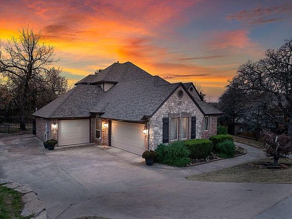 Experience this stunning residence in the sought-after Creek Bend community of east Edmond, perfectly positioned at the end of a serene cul-de-sac. Step inside to admire the elegant wood floors and a striking grand staircase. A sophisticated study with wood paneling and crown molding is conveniently located off the entry. The heart of the home is an inviting living area featuring a stone fireplace, built-ins, and expansive windows with views of the secluded backyard, pool and fire pit. The open kitchen boasts rich wood cabinetry, granite countertops, a gas cooktop, Jenn-Air oven, and a warming drawer. On the main level there's two bedrooms: a luxurious primary suite with floor-to-ceiling windows, jetted tub, walk-in shower, and a guest bedroom with an adjacent full bath. Upstairs, a spacious bonus room accompanies two additional bedrooms and two full bathrooms. The backyard is an entertainer’s dream, with a newly updated patio, a pool, and shaded area with a peach tree. Recent upgrades include 2020 HVAC units, 2023 permanent programmable Christmas lights, a new roof installed December of 2024 and a heated driveway for winter ease. Situated in a small, low-traffic neighborhood, this home offers proximity to I-35, Common Ground Sculpture Park, and upcoming community amenities like the YMCA and a library. With convenient access to Spring Creek shopping center, Edmond Public Schools, and the added benefits of a 3-car garage, sprinkler system, and wired security system, this residence combines practicality and luxury for an exceptional living experience you wont want to miss out on.