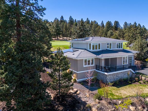 On Bend's NW side in River's Edge Village, this impressive Prairie Style home offers expansive views of the eastern skyline from an elevated homesite. Built by award winning Structure Development NW, this expansive floor plan offers main level living with an open great room design featuring a fireplace w/ built-in cabinetry, large windows bringing in abundant natural light, spacious & well designed kitchen with quartz countertops, upgraded appliances & large center island. Wide plank wood floors, modern fixtures & lighting, & a gracious primary ensuite bedroom w/curbless shower, double vanities and walk-in closet. Office/den, laundry & mudroom also on main. Plus 3 bedrooms, full bath & bonus room upstairs. Enjoy outdoor living & entertaining with privacy on the covered back patio while viewing double golf course fairways & surrounding wooded, pastoral terrain. Beautiful garden landscaping with perennial flower beds. Large garage w/ enclosed hobby room. Earth Advantage certified & Solar Panels.