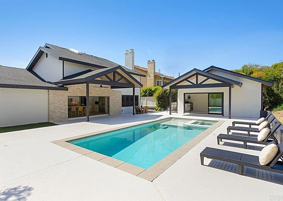 Ultimate REMODEL! Just about everything is NEW or Replaced. HIGH end finishes throughout this home that you would normally see in ultra luxury homes. This home is fit for the pickiest of buyers. Main Home is 5 bedrooms and 4 FULL baths plus Bonus ADU/Pool House with a full bath as well. This is as close to NEW CONSTRUCTION as you can get for this highly desirable area of La Costa. Magnificent entrance with custom steel doors leads you throughout this open high vaulted ceiling home with new windows, hardwood floors, Top of the line kitchen amenities. Everything is a bonus from here...… Pool House perfect for entertaining guests, resurfaced pebble tech pool and spa with new equipment. Indoor/Outdoor living area that opens up from the kitchen by a 16ft disappearing door. Back inside you'll find 1st floor bedroom and bath and separate laundry room. Walk up the beautiful new stair case to find a grand Primary bedroom with amazing walk-in closet and jaw dropping bath. 3 More bedrooms to follow one of them is ensuite with its own bathroom. This is truly a must see Turn-Key home for a buyer looking for perfection.