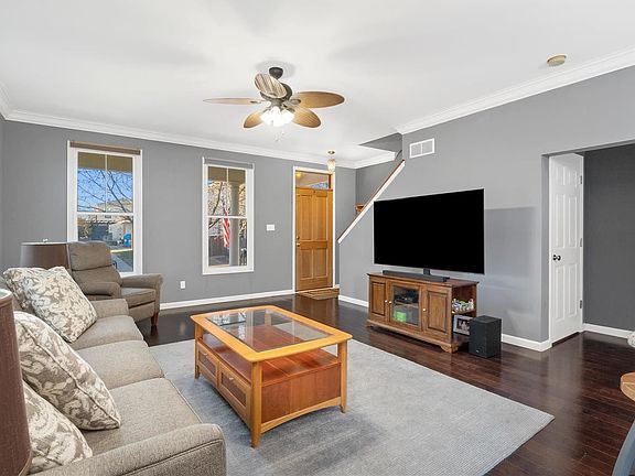 Welcome Home! This charming 2 story home located in the New Town Community has 3 bedrooms, 2.5 bathrooms, 2 car garage, & so much more. Upon entering the front door, you will be greeted w/ an open concept living space, 10 ft ceilings, crown molding, hardwood floors, & an updated kitchen with a beautiful peninsula, granite countertops. newer backsplash, crisp lighting, & SS appliances. The living room, dining area, 1/2 bath, & wonderful patio, in the partially fenced yard, finish out the main living space. All 3 bedrooms are located upstairs, along w/ 2 full baths, & the laundry area. The primary bedroom offers a walk-in closet & a private bathroom. The basement is unfinished, w/ a rough-in & has ample storage space. Rear parking is available w/ alley access to the garage. Located in the middle of New Town, you are surrounded by all the included amenities: Restaurants, Lakes, Pool, Parks, Playgrounds, Shops, and so much more. Make your appointment today!